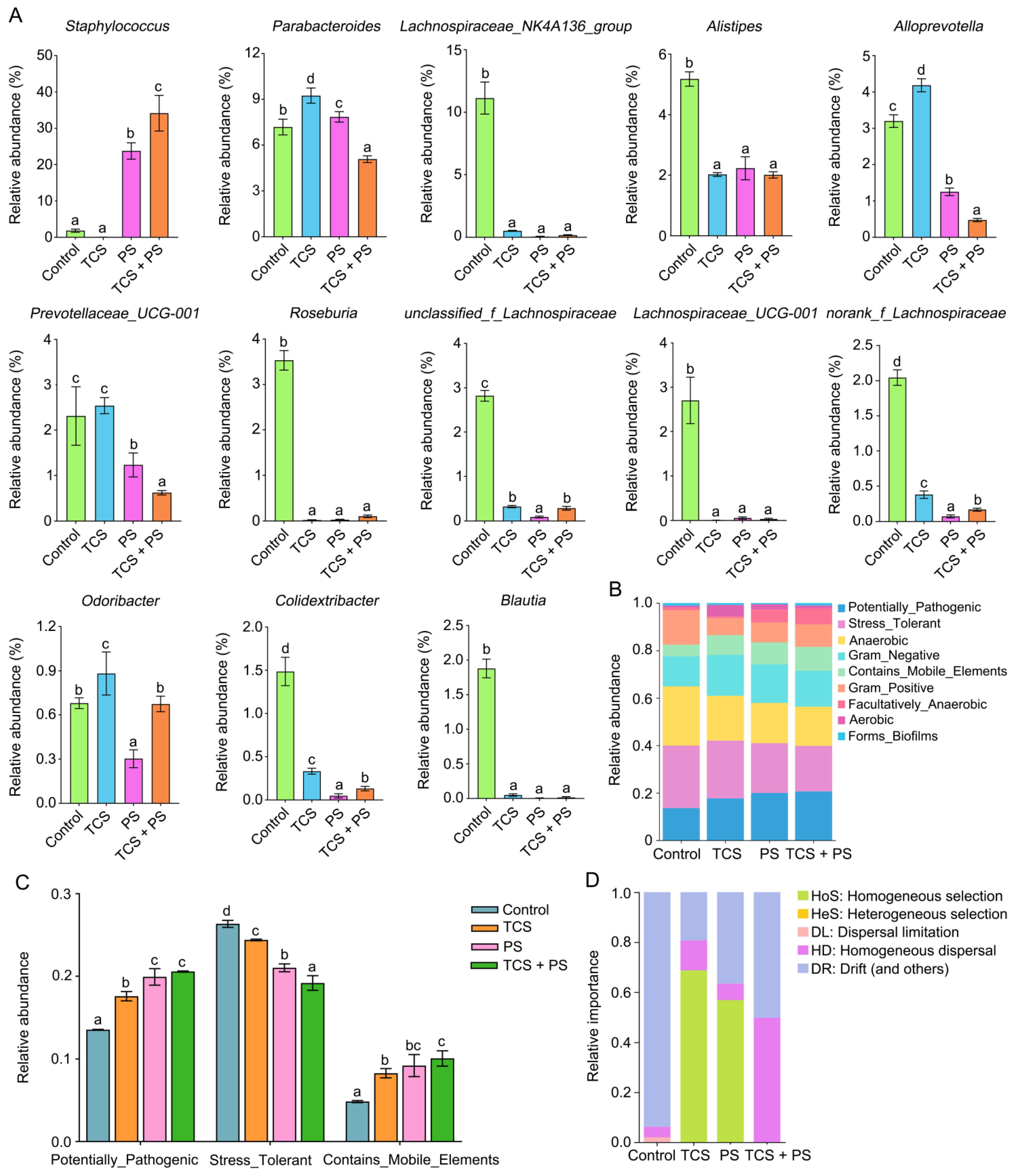 3.7. The Combined Effect of TCS and PS on Gut Microbiota Assembly Mechanisms and Phenotypic Profiles