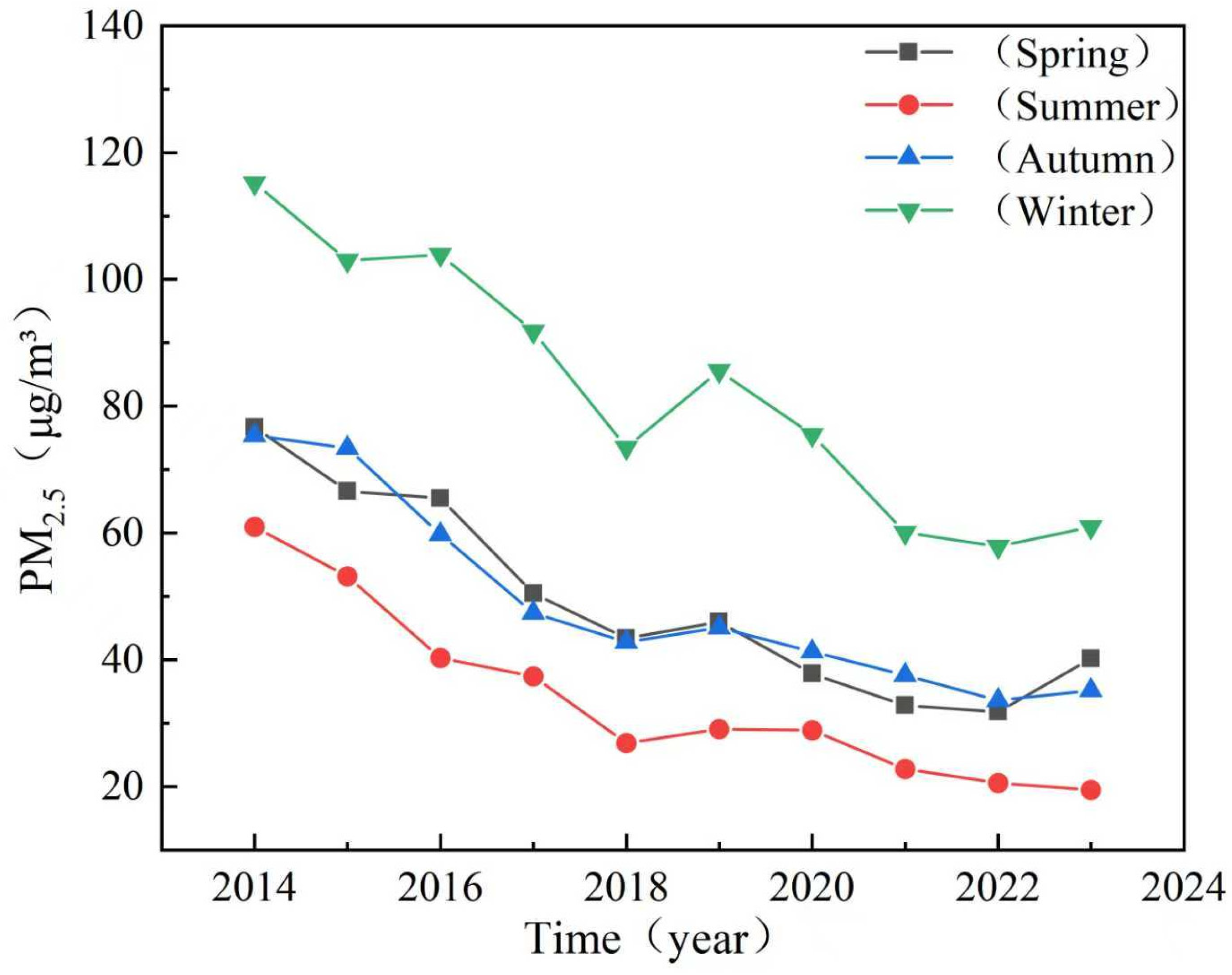 Figure 4. Seasonal variation of PM2.5 concentrations in Shandong province from 2014 to 2023.