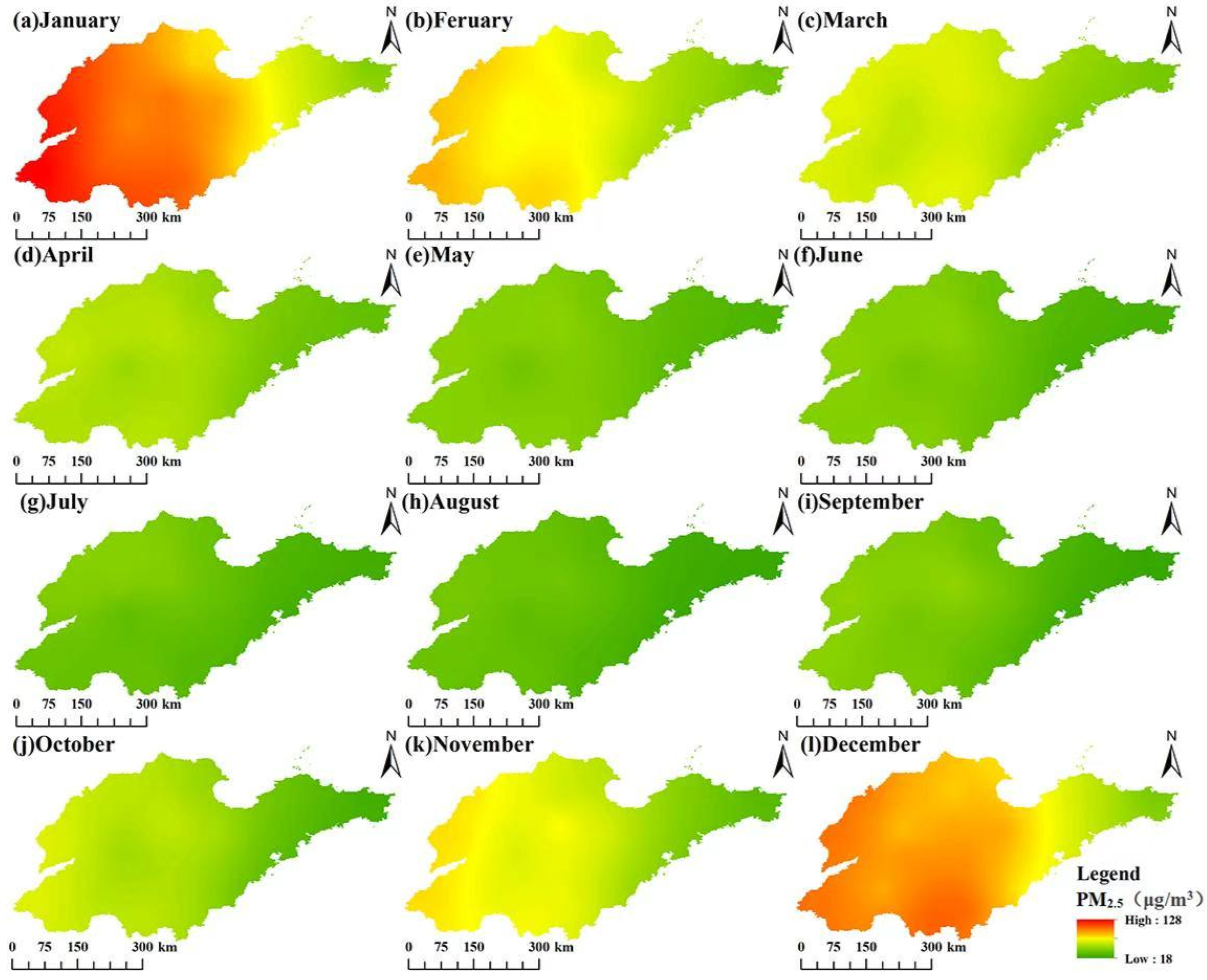 Figure 6. Monthly spatial distribution of PM2.5 concentrations.