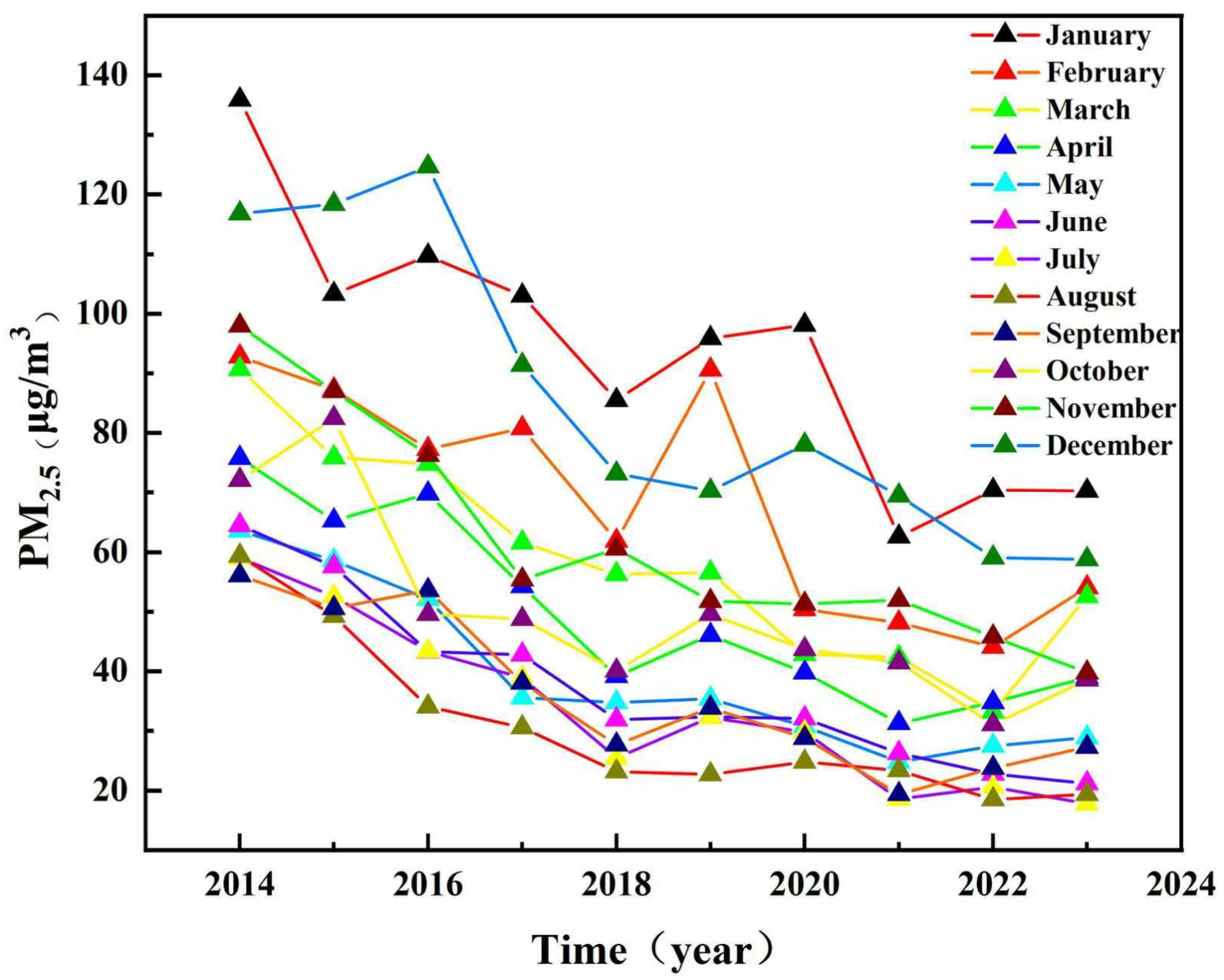 Figure 7. Monthly variation of PM2.5 concentrations in Shandong province from 2014 to 2023.