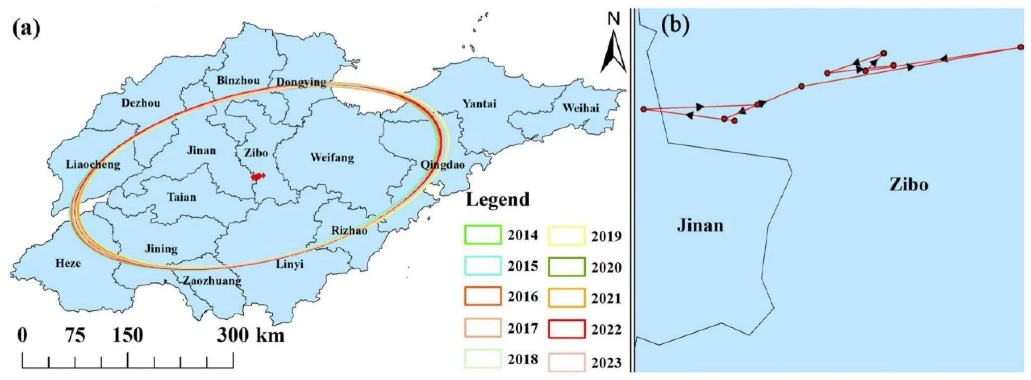 Figure 8. The standard deviation ellipses and trajectory of PM2.5 pollution centers of gravity in Shandong province from 2014 to 2023. (a) Standard deviation ellipses and gravity centers of PM2.5 concentrations over 2014–2023, (b) PM2.5 gravity center migration trajectory over 2014–2023. Circles denote the PM2.5 pollution center of gravity, triangles indicate the direction of PM2.5 pollution trajectory change, and lines represent the path of the center of gravity.