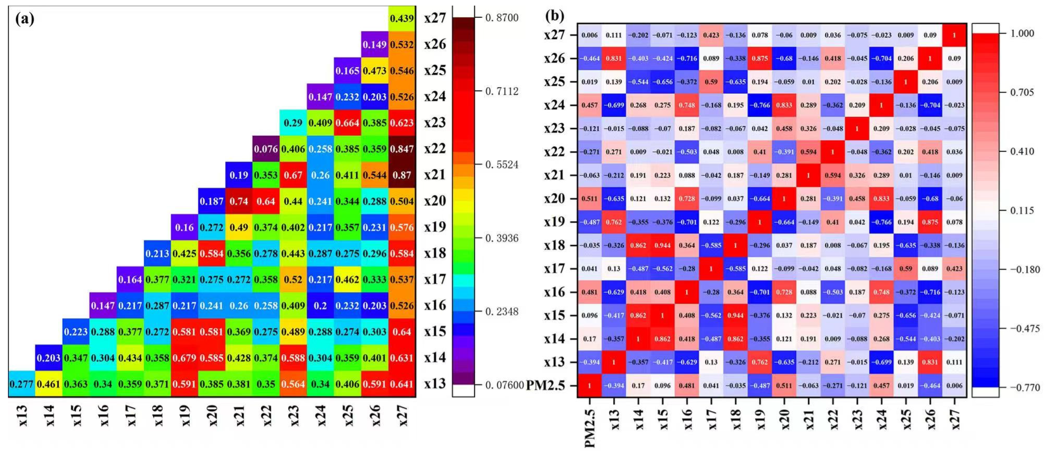 Figure 9. Interaction detection values and correlation coefficients between PM2.5 and meteorological factors. (a) Interaction detection of PM2.5 and meteorological factors (b) Correlation coefficients of PM2.5 and meteorological factors (‘x13—Maximum wind speed’, ‘x14—Minimum air pressure’, ‘x15—Maximum air pressure’, ‘x16—Maximum air temperature’, ‘x17—Precipitation’, ‘x18—Average air pressure’, ‘x19—Average wind speed’, ‘x20—Average air temperature’, ‘x21—Average water vapor pressure’, ‘x22—Average relative humidity’, ‘x23—Average minimum air temperature’, ‘x24—Average maximum air temperature’, ‘x25—Number of days with daily precipitation ≥ 0.1 mm’, ‘x26—Maximum wind speed’, ‘x27—Maximum daily precipitation’). All interactions significant at p < 0.001 level.