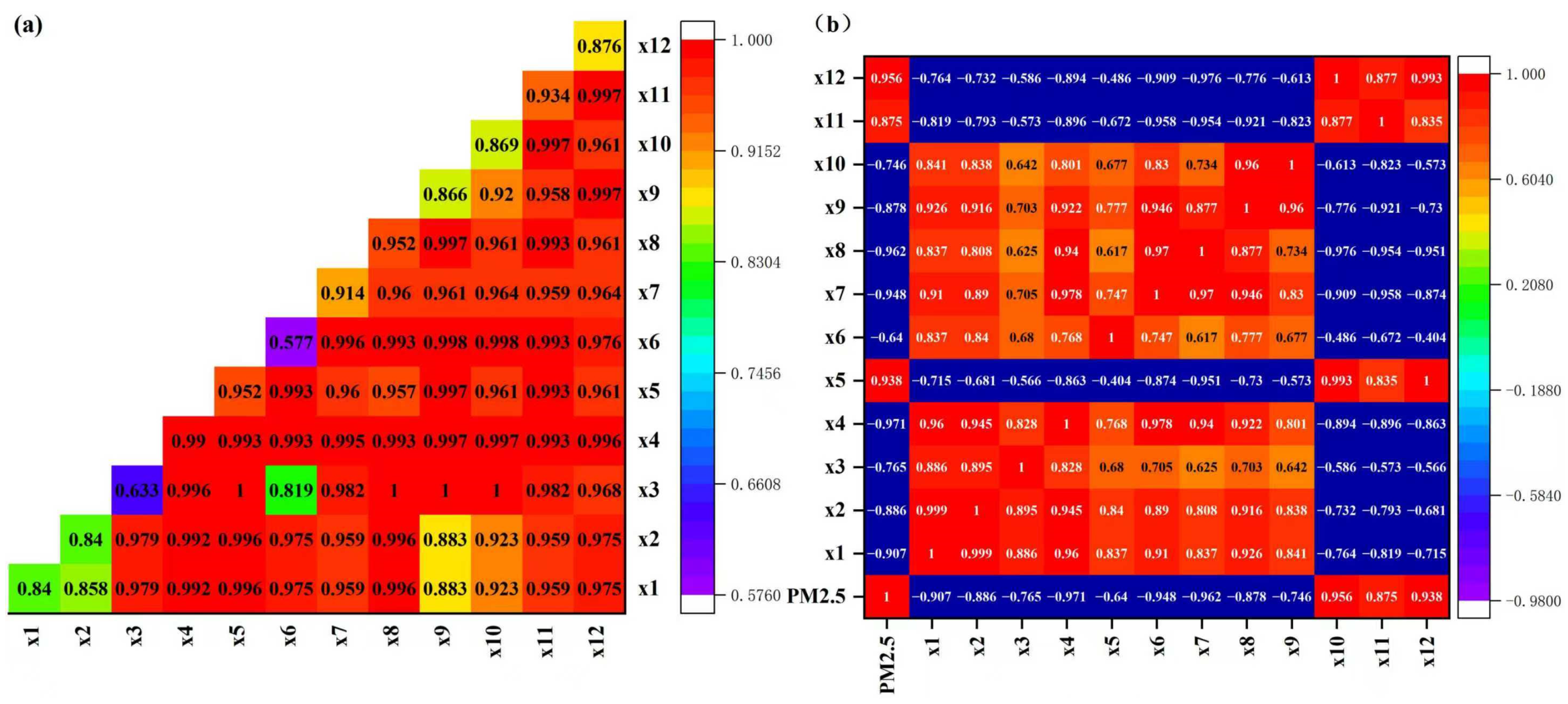 Figure 10. Interaction detection values and correlation coefficients (r) between PM2.5 and socio-economic factors. (a) Interaction effects between socioeconomic factors on PM2.5 concentrations; (b) Correlation coefficients of PM2.5 and socio-economic factors (‘x1—GDP’, ‘x2—Per capita GDP’, ‘x3—Secondary industry production’, ‘x4—Tertiary industry production’, ‘x5—Sulfur dioxide emissions’, ‘x6—Agriculture’, ‘x7—Forestry’, ‘x8—Population’, ‘x9—Electricity consumption’, ‘x10—Industrial electricity consumption’, ‘x11—Nitrogen oxides emissions’, ‘x12—Particulate matter emissions’). All interactions significant at p < 0.001 level.