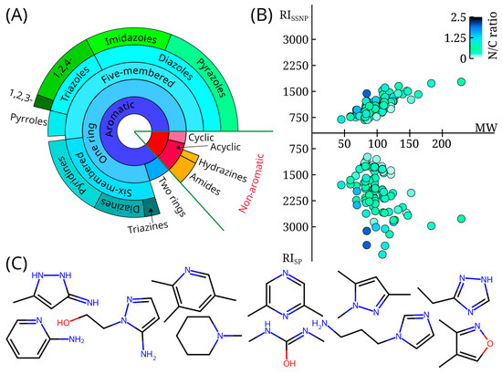 (A) The diversity of compounds with mass spectra and retention indices available in the mini-Ni database; the distribution of compounds is shown as a tree diagram, with the size of sectors within each concentric ring proportional to the number of molecules; (B) distribution of retention indices for non-polar (RIssnp) and polar (RIsp) stationary phases, as well as molecular weight (MW) for all molecules available in the mini-Ni database; the color of the marker indicates the nitrogen-to-carbon ratio (N/C ratio); (C) examples of compounds randomly selected from the mini-Ni database (3-amino-5-methylpyrazole, 2,3,5-trimethylpyridine, 2,6-dimethylpyrazine, 1,3,5-trimethyl-1H-pyrazole, 3-ethyl-1H-1,2,4-triazole, 2-aminopyridine, 2-(5-aminopyrazol-1-yl)ethanol, 1-methylpiperidine, 1,3-dimethylurea, 1-(3-aminopropyl)imidazole, dimethylisoxazole).