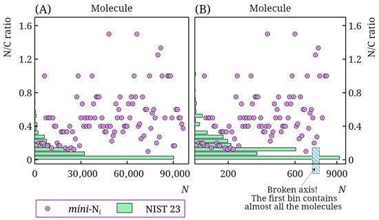 Distribution of molecules in the NIST 23 and mini-Ni retention index databases by nitrogen-to-carbon ratio (N/C ratio) for non-polar (A) and polar (B) stationary phases; for the mini-Ni database, the N/C ratio is shown for all molecules (in arbitrary order), for the NIST 23 database, the number of molecules N in a bin is shown; note the axis break in subplot (B).