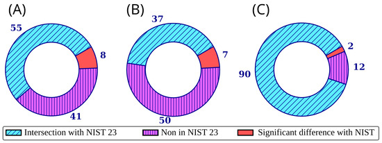 Overlap between the mini-Ni database and the NIST 23 database for retention indices on a non-polar stationary phase (A), retention indices on a polar stationary phase (B), and mass spectra (C); each ring corresponds to all compounds in the mini-Ni database; significant differences are defined as differences in retention indices of 70 and 100 units (non-polar and polar stationary phase, respectively); the discrepancy between mass spectra in the mini-Ni database and NIST 23 is discussed below.
