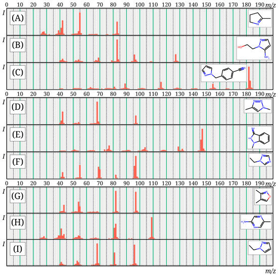 Mass spectra of compounds from the mini-Ni database, not included in the NIST 23 database, not previously published: 2-methyl-1-pyrroline (A); 2-(5-aminopyrazol-1-yl)ethanol (B); 4-(1H-pyrazol-1-ylmethyl)benzonitrile (C); 1,4-dimethyl-1H-1,2,3-triazole (D); 1-methyl-1H-indazol-3-amine (E); 1-ethyl-1H-1,2,4-triazole (F); dimethylisoxazole (G); 2-amino-5-methylpyrazine (H); 1-ethylpyrazole (I).
