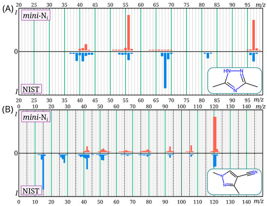 For the mass spectra, the match factor calculated using the Identity algorithm [28,29] was used as a similarity criterion between our mass spectra and those from the NIST 23 database. In all cases except two, it was at least 840 (out of a possible 1000), which corresponds to satisfactory similarity [31]. For 3,5-dimethyl-4H-1,2,4-triazole and 1,3-dimethyl-1H-pyrazole-4-carbonitrile, the match factor values were 414 and 799, respectively. Thus, in two cases, there is a significant discrepancy between the mass spectra from the NIST 23 database and the mini-Ni database. The corresponding pairs of mass spectra are shown in Figure 5. For 3,5-dimethyl-4H-1,2,4-triazole, a large difference between the mass spectra is observed. For all similar compounds (methyltriazoles, methyldiazoles), the molecular ion peak is very intense; in this case, it is not very intense in the mass spectrum from the NIST database. Such a low molecular ion intensity was not observed for any of the similar compounds. In the case of 1,3-dimethyl-1H-pyrazole-4-carbonitrile, the difference between the mass spectra is less significant (this spectrum was recorded with an m/z range of 40–500). The reasons for the differences between the mass spectra observed in the current work and in the NIST database for these two molecules are unknown.