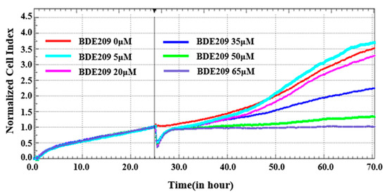 Cell proliferation is an important indicator for evaluating the cytotoxic effects of pollutants. We plotted the proliferation curves of Beas-2B cells under BDE209 stimulation by using a real-time label-free cell analyzer (RTCA). Electrical impedance measurements of Beas-2B cells were assessed using the normalized cell index (NCI).