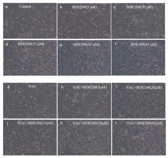 Observed morphological changes in cells stimulated by BDE209 under a 40× inverted microscope ((a–f): BDE209 exposure group, (g–l): NAC + BDE209 exposure group).