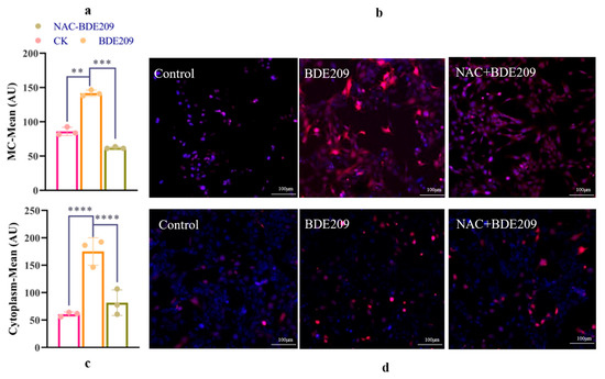 The aim was to perform a quantitative comparison of changes in ROS levels. Whereas mitochondria are the main site of cellular energy conversion and metabolism. From Figure 3a, both control and BED209-exposed Beas-2B cells produce more ROS than that intracytoplasmic. The levels of ROS in mitochondria increase significantly under BDE209 treatment (p < 0.0001). The inhibitory effect of NAC on ROS is also very significant (p < 0.0001). The levels of ROS for the NAC + BDE209 exposure group are significantly less than that for the BDE209 exposure group (p < 0.0001). From Figure 3c, cells normally produce some ROS for intracellular metabolic activities. The levels of ROS are significantly increased in BDE209-exposed cells compared to control Beas-2B cells (p < 0.01). The levels of ROS for the NAC + BDE209 exposure group are significantly less than that for the BDE209 exposure group (p < 0.001).