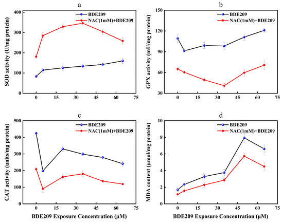 The role of SOD is to disproportionate O2− to H2O2 [41]. The activities of SOD in the control group are 83.51 U/mg protein. Compared to the control, the levels of SOD after exposure to BDE209 show a concentration-dependent significantly upward trend (Figure 4a). SOD activity is highest at 65 µM with 159.83 U/mg protein. This result conforms with Jian’s research [42]. On the one hand, exposure to pollutants within the body’s tolerance range can induce the activation of the antioxidant-enzyme system [43,44]. On the other hand, the above distinction in SOD may arise from the variation in the unequally biological responses to exogenous pollutants in different organisms and the significant distinction in the sensitivity of SOD to varying levels of oxidative stress [45,46]. After the addition of the antioxidant NAC, the levels of SOD increased to 180.87 U/mg protein. With increasing concentration of BDE209 exposure, the SOD activities increased to 345.93 U/mg protein in 35 µM. However, it took a turn and significantly downregulated to 258.42 U/mg protein. The levels of SOD for the NAC exposure group are still higher than that for the BDE209 exposure group. Mahmoud et al. found that the activities of SOD in the rat brain for the NAC + CPF exposure group are higher than that for the CPF exposure group [47]. Liu et al. also found that NAC treatment can reduce the activities of SOD to attenuate the oxidative damage induced using cold medicine protein (PAT) [48]. The present results demonstrate the effectiveness of NAC in protecting Beas-2B cells against oxidative stress resulting from BDE209 intoxication. This occurred by increasing SOD activity.