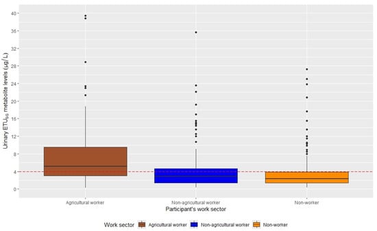 Similarly, the participant’s work sector was related to having ETUSG levels higher than 4 μg/L, adjusting for relevant covariates (Table 2). Agricultural workers had higher odds of ETUSG levels > 4 μg/L when compared to non-workers (OR = 5.43, 95% CI = (3.14, 9.38), p-value < 0.0001); non-agricultural workers had higher odds of ETUSG levels > 4 μg/L when compared to non-workers (OR = 1.89, 95% CI = (1.14, 3.14), p-value = 0.014); and finally, agricultural workers had higher odds of ETUSG levels > 4 μg/L when compared to non-agricultural workers (OR = 2.87, 95% CI = (1.72, 4.81), p-value < 0.0001).