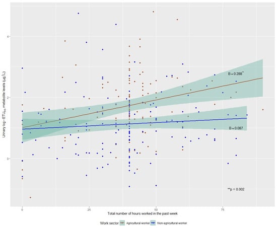 Secondly, we sought to test whether work hours were related to ETUSG levels among working participants (hypothesis 2). The participant’s work sector at baseline had a significant effect on log-ETUSG concentration levels. Within the workers-only population (agricultural and non-agricultural workers), we found an association between the number of hours worked in the past week and log-ETUSG levels, varying by the participant’s work sector (p-value for interaction = 0.052). For agricultural workers, ETUSG levels were higher for greater work hours in the past week (B = 0.288, 95% CI = (0.105, 0.472), p-value = 0.002). For non-agricultural workers, there was no dose–response relationship between hours worked in the past week and ETUSG levels (B = 0.087, 95% CI = (−0.064, 0.249), p-value = 0.291). All data points and their subsequent lines of best fit (grouped by their work sector) and CIs, are illustrated in Figure 2.