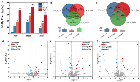 MeHg accumulation of six-week-old rice seedlings after exposure to 50 (low), 150 (middle), and 300 (high) μg kg−1 CH3HgCl (MeHg) for 60 days and in the control without MeHg addition (CK). (a) MeHg concentrations in leaves, stems, and roots (different letters indicate significant differences among the four treatments (p < 0.05, one-way ANOVA); mean ± SD). (b) Venn diagram of the DE-miRNAs in roots of rice after exposure to MeHg and in the control. (c) Venn diagram of the target gene in roots of rice after exposure to MeHg and in the control. (d–f) Volcano plot of the amount of DE-miRNAs upregulated and downregulated in each treatment (con vs. low, con vs. middle, and con vs. high).