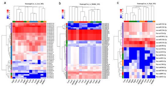 To further investigate differences in MeHg tolerance, gene expression patterns in the three stress groups were analyzed. The hierarchical cluster heatmap revealed that 39, 52, and 18 DE-miRNAs were upregulated or downregulated under low, middle, and high MeHg stress, compared to the control group, respectively (Figure 2). In the con vs. low datasets, the miRNA1861 family (9 members) and the miRNA319 family (2 members) were upregulated, which contrasts with the downregulation of osa-miR1861a in rice under arsenic stress [33]. This difference in expression patterns may indicate the distinct roles played by miRNA family members and emphasize the complex regulatory mechanisms in rice responding to various heavy metal stressors. The miRNA156 family (6 members) and the miRNA160 family (5 members) are downregulated. In the con vs. middle datasets, several miRNA families were significantly upregulated, including the miRNA395 family (16 members), miRNA1861 family (2 members), miRNA390 family (2 members), and miRNA393b-3p (1 member). This is consistent with the upregulation of miR393 in Medicago truncatula under Hg stress, suggesting that these miRNAs may alleviate Hg toxicity by regulating target genes expression [34]. Conversely, the miRNA156 family (15 members) and miRNA531 (3 members) were downregulated. In the con vs. high datasets, osa-miR319a-3p and osa-miR390-5p were upregulated, while the miRNA156 family (4 members) was downregulated under MeHg stress (Figure 2).