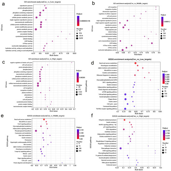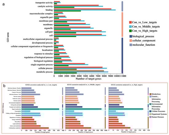 (a) Gene Ontology (GO) and (b) Kyoto Encyclopedia of Genes and Genomes (KEGG) annotation analysis showing that multiple terms/pathways were enriched in the 19,246, 8819, and 20,789 miRNAs shared by the three datasets, i.e., con vs. low, con vs. middle, and con vs. high.