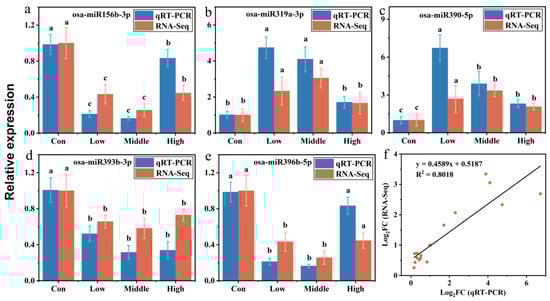 qRT-PCR validation of miRNA. The relative expression of specific miRNAs was calculated using the 2−ΔΔCt method. Five miRNAs found to be differentially expressed were analyzed by qRT-PCR. (a) Metabolism processes-related miRNA. (b) Signal transduction-related miRNA. (c) Biosynthesis and plant–pathogen interaction-related miRNA. (d,e) Two miRNAs related to heavy metals stress were screened. (f) Correlation analysis of gene expression between RNA-Seq data and qRT-PCR results. RNA-Seq data were plotted against data from qRT-PCR. Data are presented as a [log2(fold change)] value (log2FC). Different letters (a, b, c) above the bars indicate statistically significant differences (p < 0.05, one-way ANOVA followed by Tukey’s HSD test).