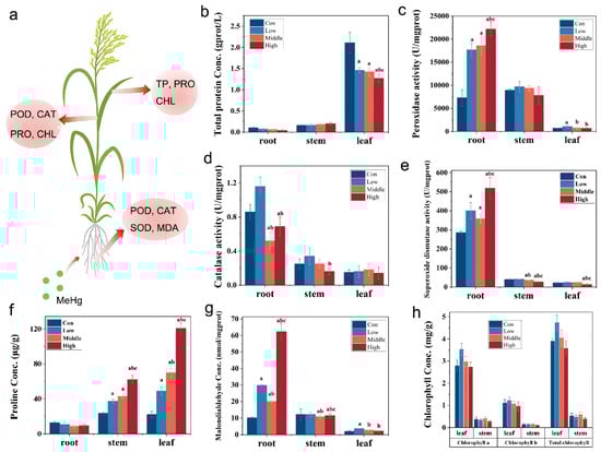 Physiological and biochemical responses of six-week-old rice seedlings after exposure to low, middle, and high MeHg for 60 days and in CK. (a) Indices of different parts/organs of rice changed significantly under MeHg stress. (b) TP. (c) POD. (d) CAT, (e) SOD, (f) PRO, (g) MDA, and (h) CHL activities. Different letters (a, b, c) above the bars indicate statistically significant differences (p < 0.05, one-way ANOVA followed by Tukey’s HSD test).