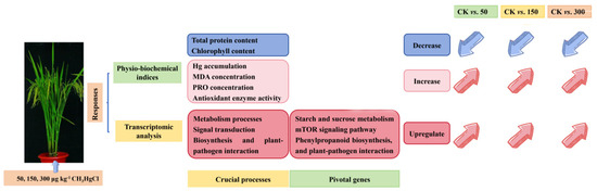 Summary of the transcriptomic and physiological and biochemical features in rice plants in response to different levels of MeHg stress.