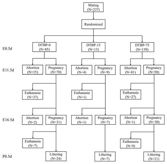 Sexually mature female mice (8–12 weeks old) were used in the present study. Mice were paired at a female-to-male ratio of 2:1 in the evening, and the day a vaginal plug was observed was designated as embryonic 0.5 day (E0.5d). Female mice were randomly assigned to different groups, and received daily oral gavage for 19 consecutive days throughout the entire pregnancy (E0.5d–E18.5d) (Figure 1). All groups received a daily intragastric gavage of the same vehicle solution at a volume of 5 µL/g·day. The vehicle was composed of ultrapure water containing 1% DMSO, 40% PEG 300, and 5% Tween 80. For the treatment groups (DTBP-75 and DTBP-15), the vehicle was supplemented with 75 or 15 µg/g·day of 2,4-DTBP, respectively, while the control group (DTBP-0) received the vehicle without supplementation. The dosage was determined based on the NOAEL of 2,4-DTBP [20,21]. All solutions were freshly prepared each day. During the experiment, a subset of mice in DTBP-75 and DTBP-15 group was randomly selected at E11.5d, E16.5d, and postnatal 0.5 day (P0.5d) for blood collection and euthanasia (Figure 2). Pregnancy was confirmed based on a sustained increase in body weight or direct dissection, respectively.
