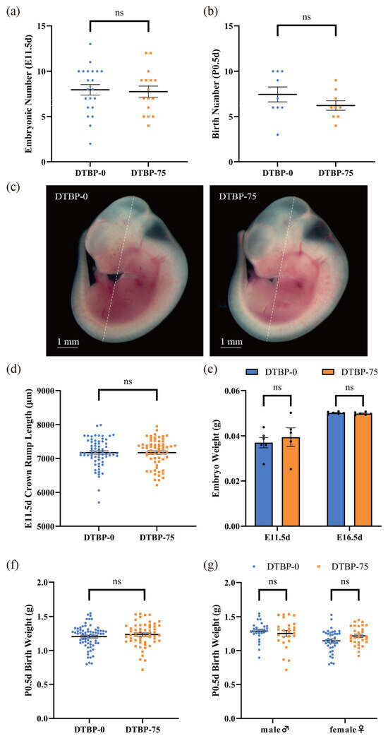 No differences were observed in the number of embryos at E11.5d between the DTBP-0 group and the DTBP-75 group (7.95 ± 0.58 vs. 7.75 ± 0.61, p = 0.81; N = 21, 16, respectively; Figure 4a), and no notable changes in the number of offspring were observed at P0.5d (7.44 ± 0.82 vs. 6.22 ± 0.52, p = 0.23; N = 9; Figure 4b). The crown-rump length of the embryos at E11.5d was not significantly different (7174.42 ± 50.38 vs. 7174.55 ± 52.45 µm, p = 1.00; n = 68 from 8 litters, 62 from 9 litters, respectively; Figure 4c,d). A linear mixed-effects model, incorporating litter as a random effect, was used to account for litter structure. This analysis also revealed no significant difference in the adjusted crown-rump length at E11.5d between the DTBP-0 (7190.07 ± 85.51 µm) and DTBP-75 (7157.90 ± 83.24 µm) groups (p = 0.79). No notable changes in embryo weight were noted at E11.5d or E16.5d (0.0370 ± 0.0023 vs. 0.0394 ± 0.0041 g, p = 0.60; n = 6, 5, respectively; 0.0501 ± 0.0002 vs. 0.0498 ± 0.0003, p = 0.40; n = 6; Figure 4e). At P0.5d, the body weight of the newborn mice had no significant difference between two groups (1.2036 ± 0.0208 vs. 1.2340 ± 0.0234 g, p = 0.33; n = 67 from 9 litters, 56 from 9 litters, respectively; Figure 4f) and was not influenced by sex (Figure 4g). The litter-adjusted body weights of neonatal mice were 1.2269 ± 0.0477 and 1.2317 ± 0.0479 g, respectively (p = 0.94), also with no distinct differences.