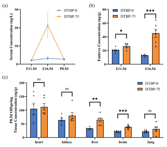 Quantitative analysis of 2,4-DTBP was performed on the serum of maternal mice at E11.5d, E16.5d and P0.5d (Figure 5a). During mid-pregnancy (E16.5d), the serum 2,4-DTBP level in the DTBP-75 group reached 21.2385 ± 6.6883 ng/L (n = 6), which was significantly greater than that in early pregnancy (E11.5d), with a 6.6-fold increase compared with that in the DTBP-0 group (3.2310 ± 0.8132 ng/L, p = 0.02; n = 6). At both E11.5d and P0.5d, no distinct differences in serum concentrations were observed between DTBP-0 and DTBP-75 groups (2.0826 ± 0.1105 vs. 2.1590 ± 0.0446 ng/L, p = 0.54; n = 5; 2.7585 ± 0.3288 vs. 2.6310 ± 0.5875 ng/L, p = 0.85; n = 6).