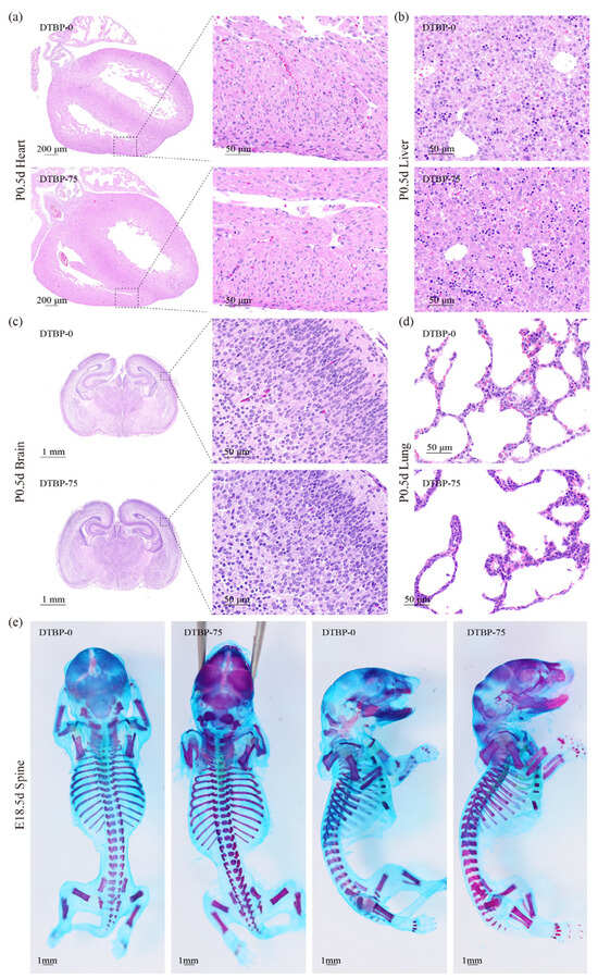 Morphological and pathological observations of P0.5d mice organs revealed an increased risk of CAKUT in offspring from the 2,4-DTBP exposed groups. Distinct cardiac pathologies, including hypertrophy and myocardial disarray, were observed in the DTBP-75 group (Figure 6a). Hepatic, cerebral, and pulmonary development exhibited no significant abnormalities (Figure 6b–d), nor did skeletal morphogenesis in E18.5 embryos (Figure 6e).