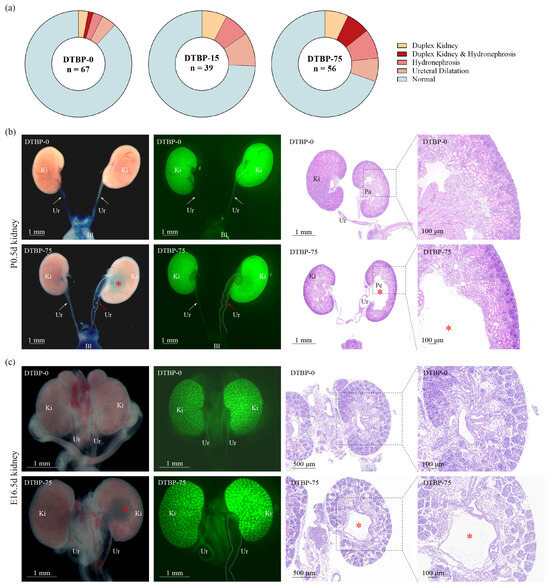 A greater proportion of CAKUT was observed in the DTBP-75 group than in the DTBP-0 group (30.36% vs. 11.94%, p = 0.01; Figure 7a, Table S1). The incidence of duplex kidney increased from 4.48% to 14.29%, whereas the proportion of hydronephrosis/ureteral dilation increased from 8.96% (4.48% for hydronephrosis, 4.48% for ureteral dilation) to 23.21% (16.07% for hydronephrosis, 7.14% for ureteral dilation). The DTBP-15 group also exhibited a non-significant, albeit higher, prevalence of CAKUT (25.64% vs. 11.94%, p = 0.11; Figure 7a), with the incidence of duplex kidney increased to 7.69%, and the frequency of hydronephrosis/ureteral dilation increased to 17.95% (7.69% for hydronephrosis, 10.26% for ureteral dilation).