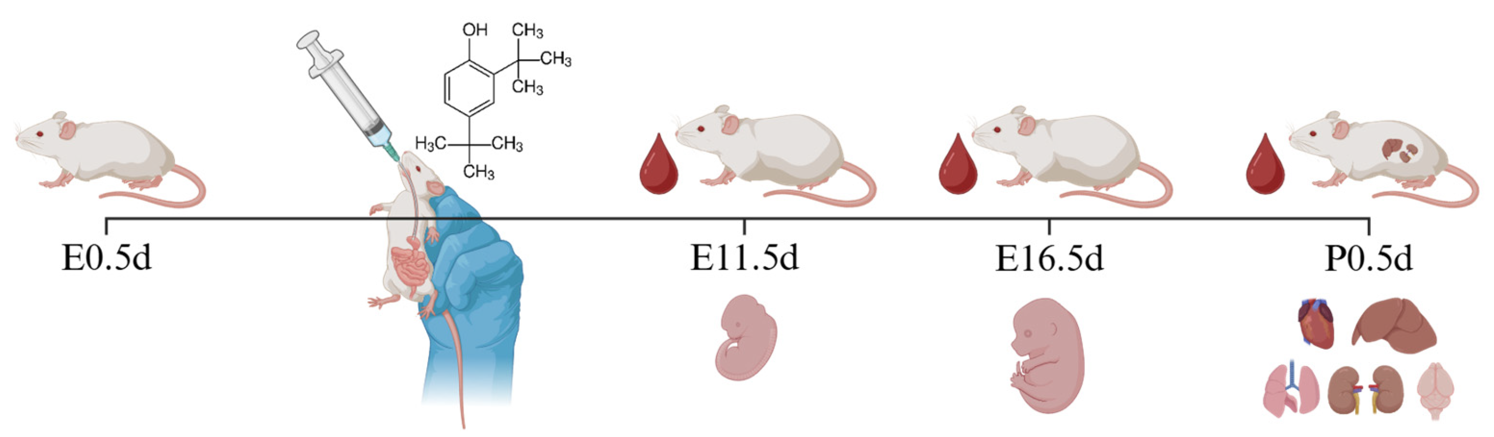 Jiang, Y.; Ye, N.; Yu, M.; Ju, H.; Wang, C.; Wang, H.; Liu, J.; Shen, Q.; Xu, H. Maternal Exposure to 2,4-Di-tert-butylphenol During Pregnancy in a Mouse Model Leads to Abnormal Development of the Urinary System in Offspring. Toxics 2025, 13, 991. https://doi.org/10.3390/toxics13110991