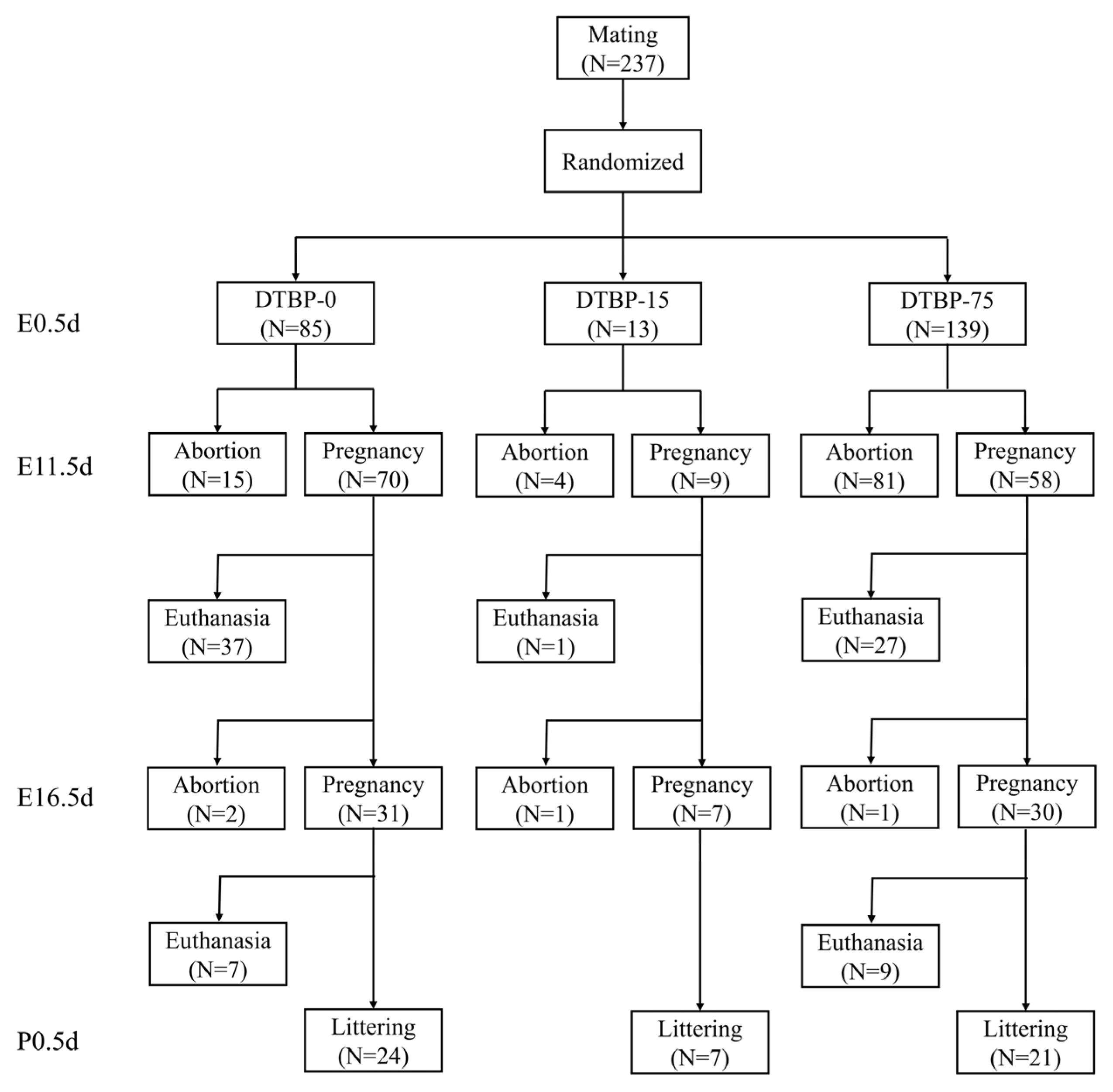 3.2. The Effects of Intrauterine Exposure to 2,4-DTBP on the Number and Size of Offspring