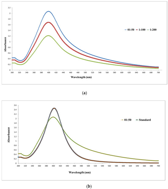 (a) UV-VIS spectra of the 1000 mg/L colloidal silver solution at dilutions of 1:50, 1:100, and 1:200. The optical densities at LSPR peak (400 nm) were 2.071, 1.684, and 1.217, respectively, confirming the proportional decrease with dilution and indicating colloidal stability. (b) Comparative UV-VIS spectra of standard colloidal silver solution (Sigma-Aldrich) containing nanoparticles of 10 nm in diameter at a concentration of 20 mg/L and of the 1:50 dilution of 1000 mg/L colloidal silver solution, highlighting differences in spectral profile and peak symmetry.