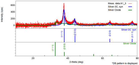 X-ray diffraction (XRD) pattern of the dried 1000 mg/L colloidal silver solution (A1_3). * DB—Powder Data Files DataBase pattern is displayed.