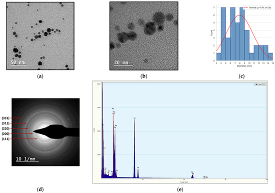 Representative BF-TEM micrographs, SAED pattern, and size distribution histogram of the silver nanoparticles: (a) Ag NPs at 100,000×; (b) Ag NPs at 280,000×; (c) size distribution histogram of the silver nanoparticles (raw data is in Table S1); (d) the concentric diffraction rings; (e) EDX spectrum.