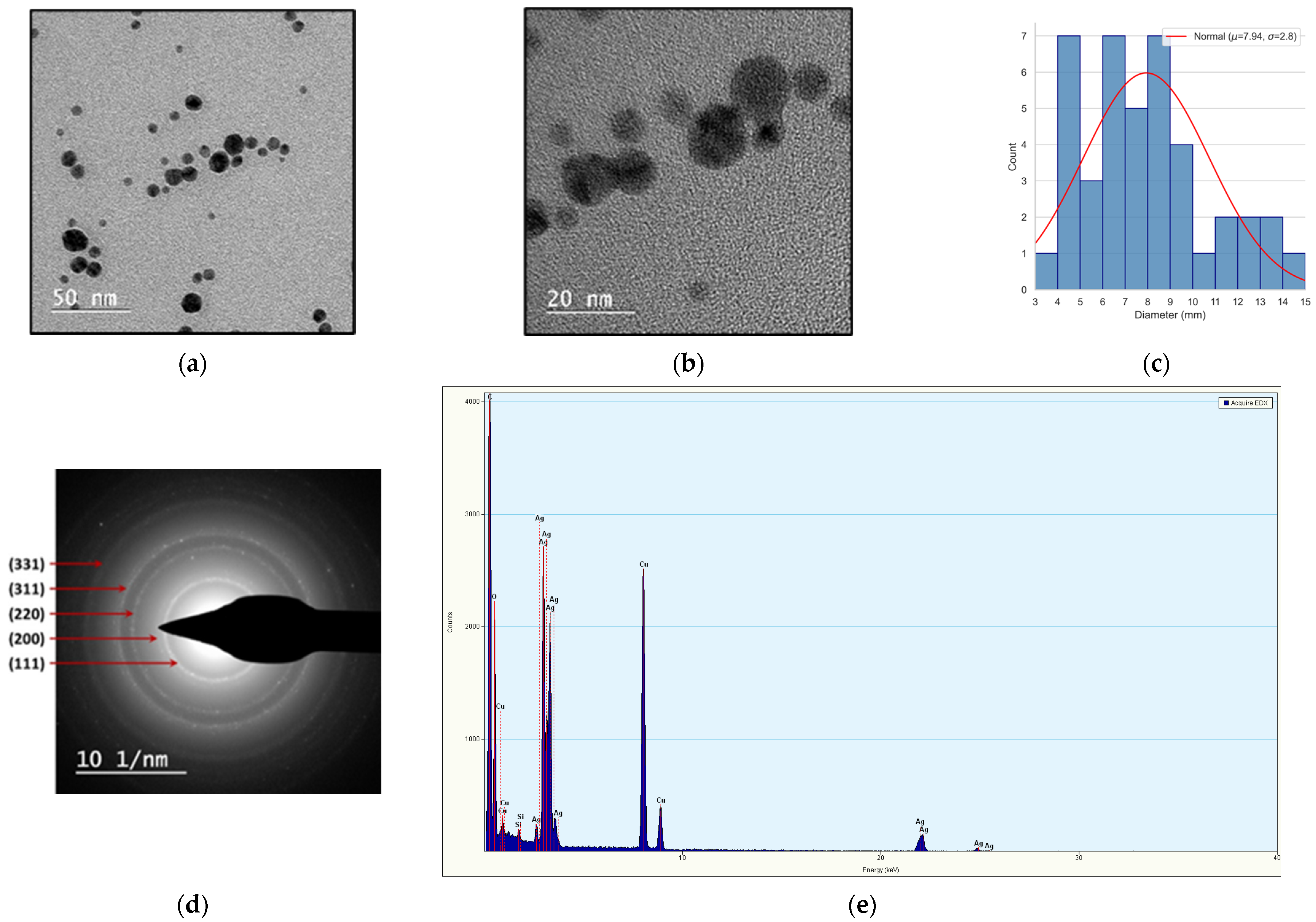 - Ali, M.H.; Azad, M.A.; Khan, K.A.; Rahman, M.O.; Chakma, U.; Kumer, A. Analysis of Crystallographic Structures and Properties of Silver Nanoparticles Synthesized Using PKL Extract and Nanoscale Characterization Techniques. ACS Omega 2023, 8, 28133–28142. [Google Scholar] [CrossRef]