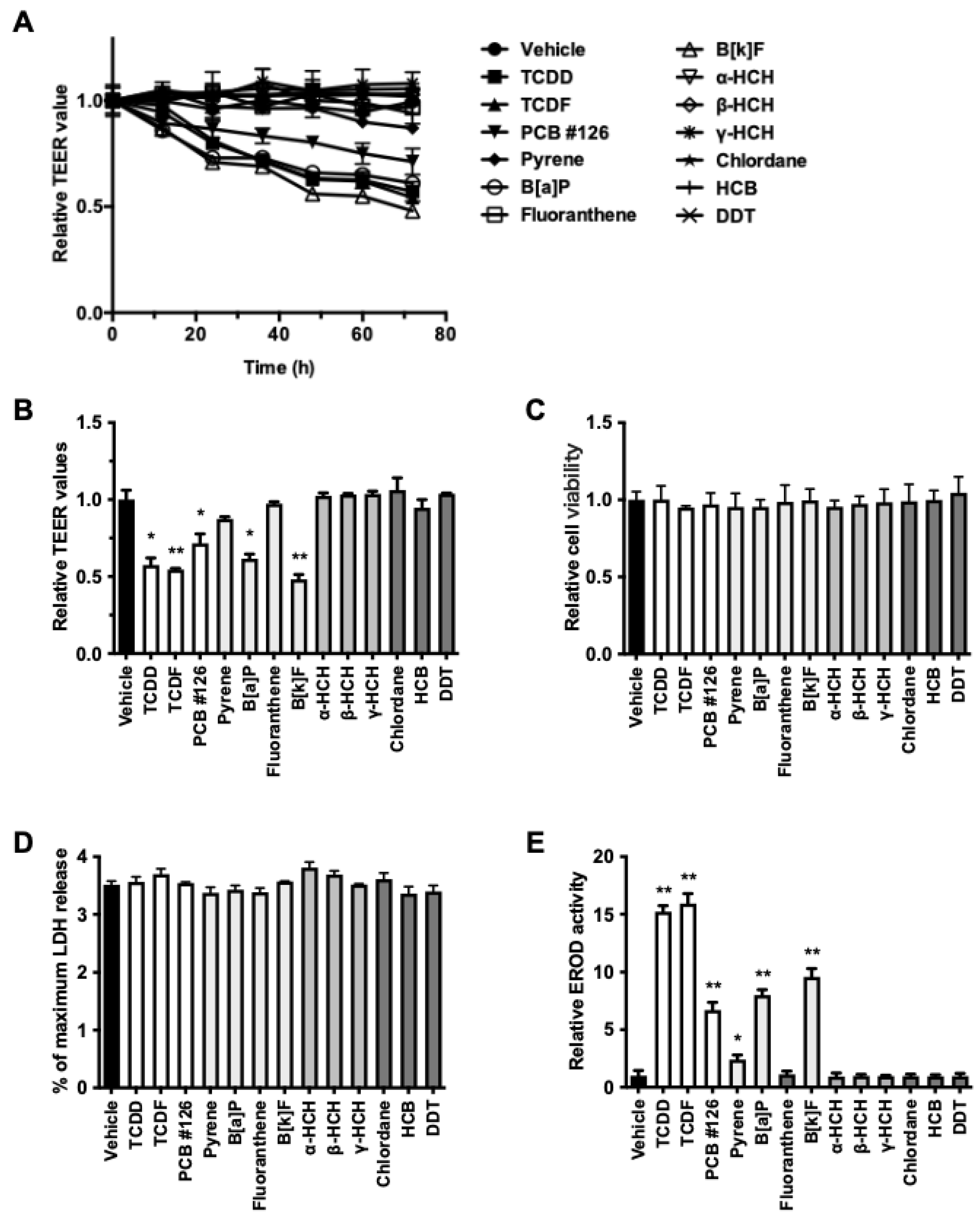 Figure 1. Environmental pollutants that disrupt barrier function. Differentiated Caco-2 cells in Transwell inserts (21 days) were stimulated with 100 nM TCDD, 100 nM TCDF, 100 nM PCB #126, 10 µM pyrene, 10 µM B[a]P, 10 µM fluoranthene, 10 µM B[k]F, 10 µM α-HCH, 10 µM β-HCH, 10 µM γ-HCH, 10 µM chlordane, 10 µM HCB, or 10 µM DDT. TEER values were measured over time (A) and quantified at 72 h (B). At 72 h, cytotoxicity was determined using WST-8 (C) and LDH release assays (D). EROD activity (E) was determined after 24 h of incubation. Values are shown as the mean ± SD (n = 5 per group). * p < 0.05, ** p < 0.01 vs. vehicle.
