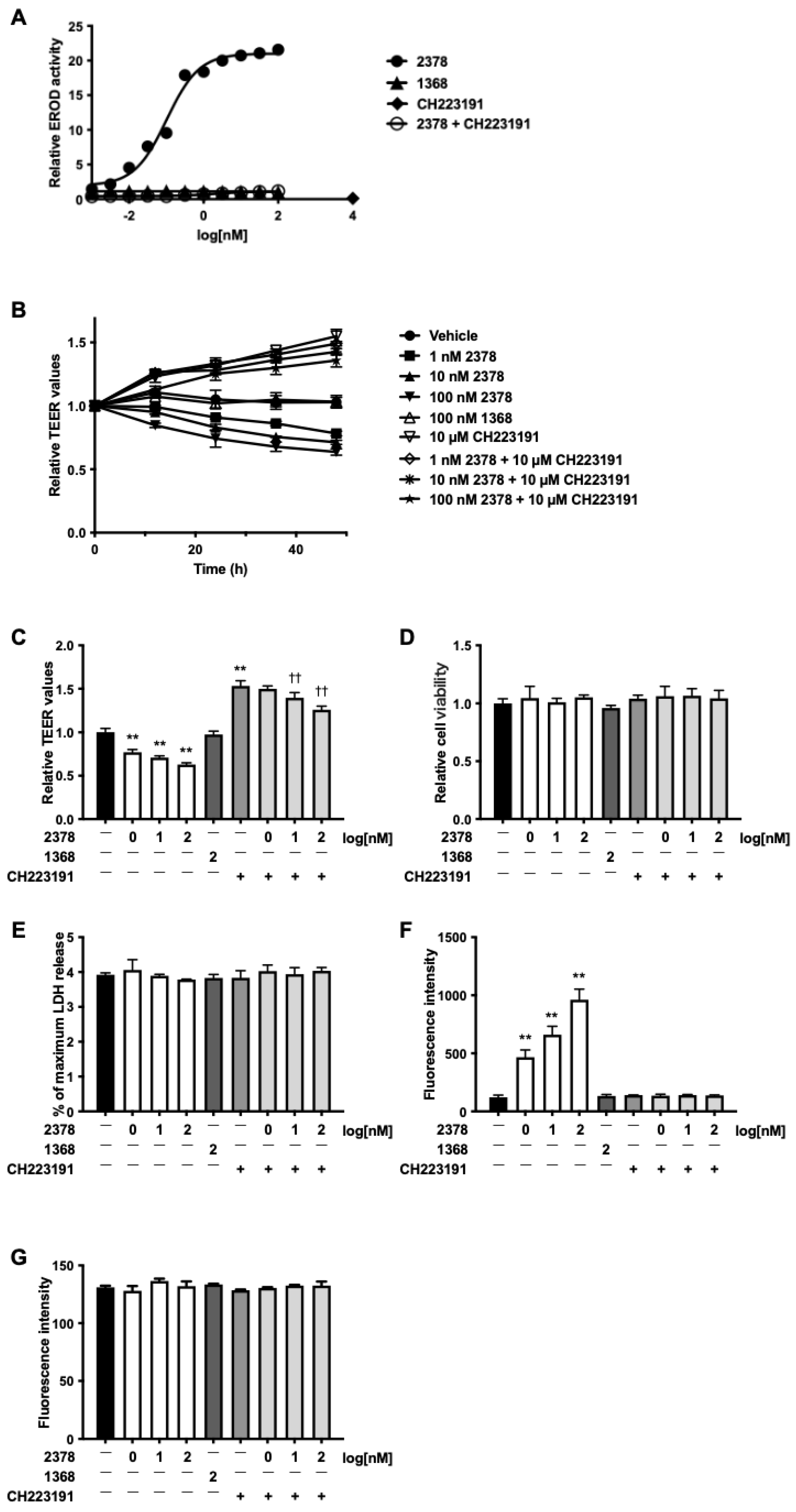 Figure 2. The AhR ligand disrupted barrier function. Monolayers of Caco-2 cells were stimulated with 2,3,7,8-TCDD or 1,3,6,8-TCDD for 24 h in the absence or presence of 10 µM CH223191. EROD activity was measured at 24 h (A). TEER values were monitored over time (B) and quantified at 48 h (C). At 48 h, cytotoxicity was determined using WST-8 (D), LDH release (E) assays. Paracellular flux assays were also conducted with FD-4 (F) and FD-10 (G). Values are shown as the mean ± SD (n = 5 per group). ** p < 0.01 vs. vehicle. †† p < 0.01 vs. CH223191-treated group.