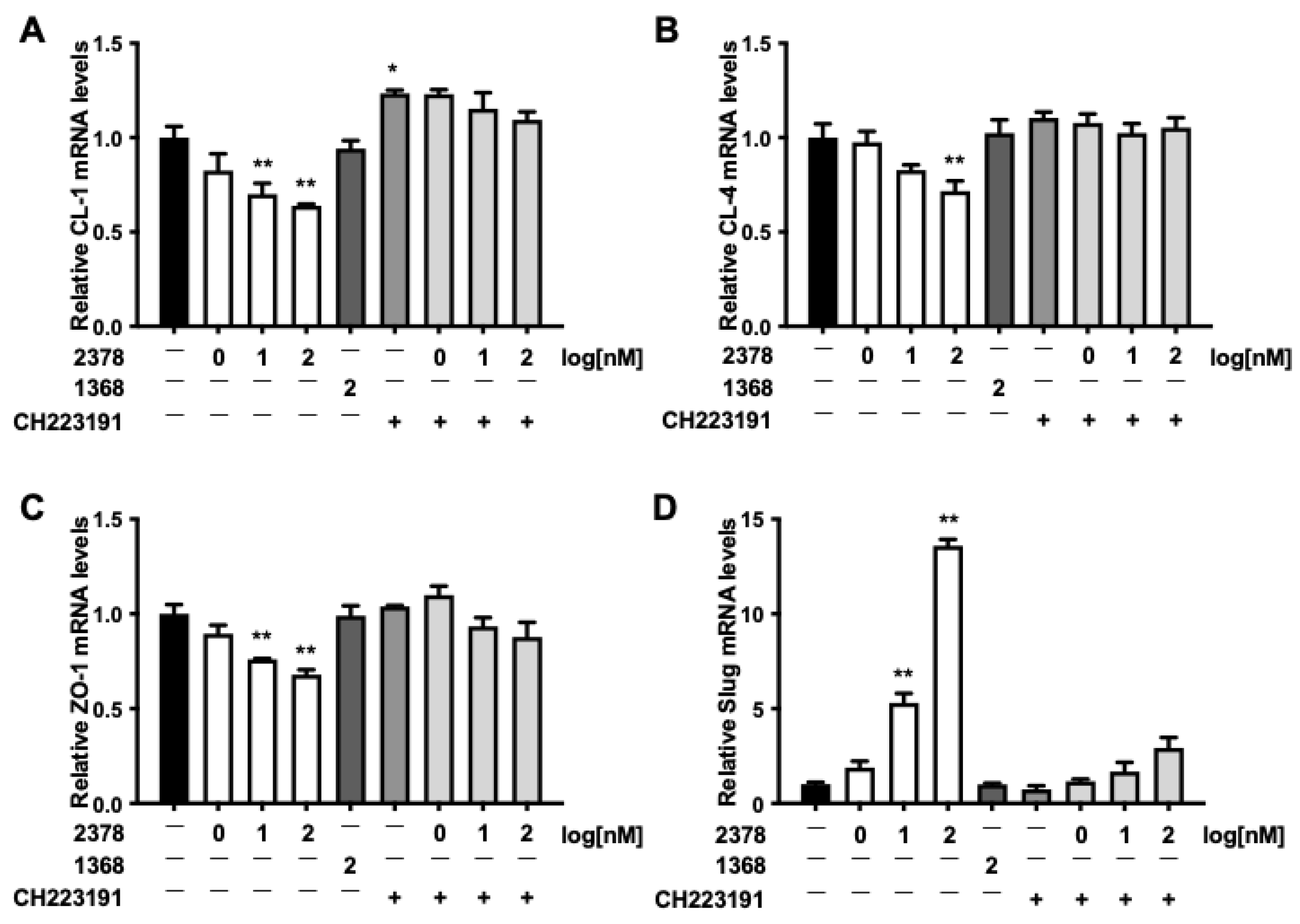 Total RNA was extracted from treated Caco-2 cells using RNAiso Plus (TaKaRa, Kyoto, Japan) and reverse-transcribed with PrimeScript RT Master Mix (TaKaRa). RT-qPCR was conducted using the KAPA SYBR FAST Universal qPCR kit (Kapa Biosystems, Boston, MA, USA) on a Thermal Cycler Dice system (TaKaRa). The specific primers employed included GAPDH (forward: 5′-TCTCTGCTCCTCCTGTTC-3′, reverse: 5′-CTCCGACCTTCACCTTCC-3′), CL-1 (forward: 5′-GGCAGATCCAGTGCAAATC-3′, reverse: 5′-TCTTCTGCACCTCATCGTCTT-3′), CL-4 (forward: 5′-GGCGTGGTGTTCCTGTTG-3′, reverse: 5′-AGCGGATTGTAGAAGTCTTGG-3′), ZO-1 (forward: 5′-CAGCCGGTCACGATCTCCT-3′, reverse: 5′-TCCGGAGACTGCCATTGC-3′), and Slug (forward: 5′-GAGCATACAGCCCCATCACT-3′, reverse: 5′-GGGTCTGAAAGCTTGGACTG-3′). GAPDH expression was consistent across samples and was used as the internal reference gen for normalization.