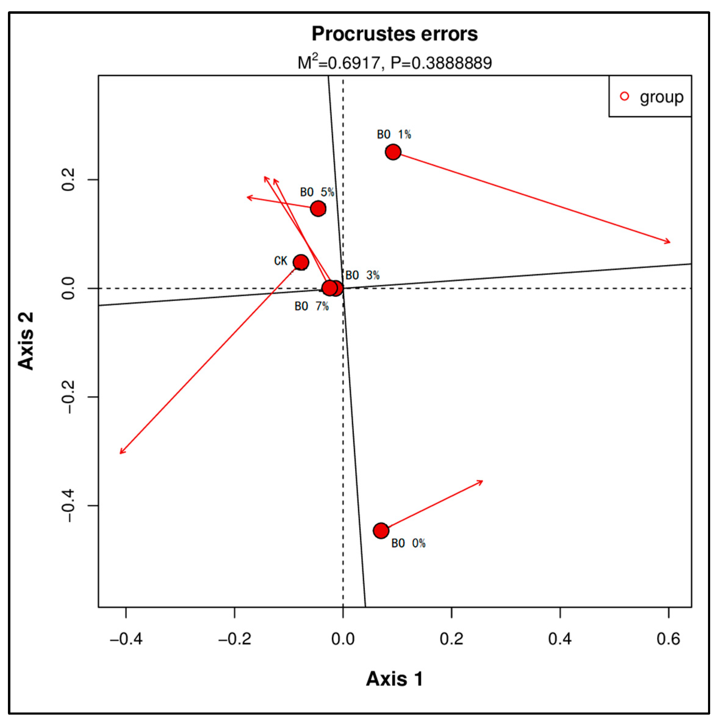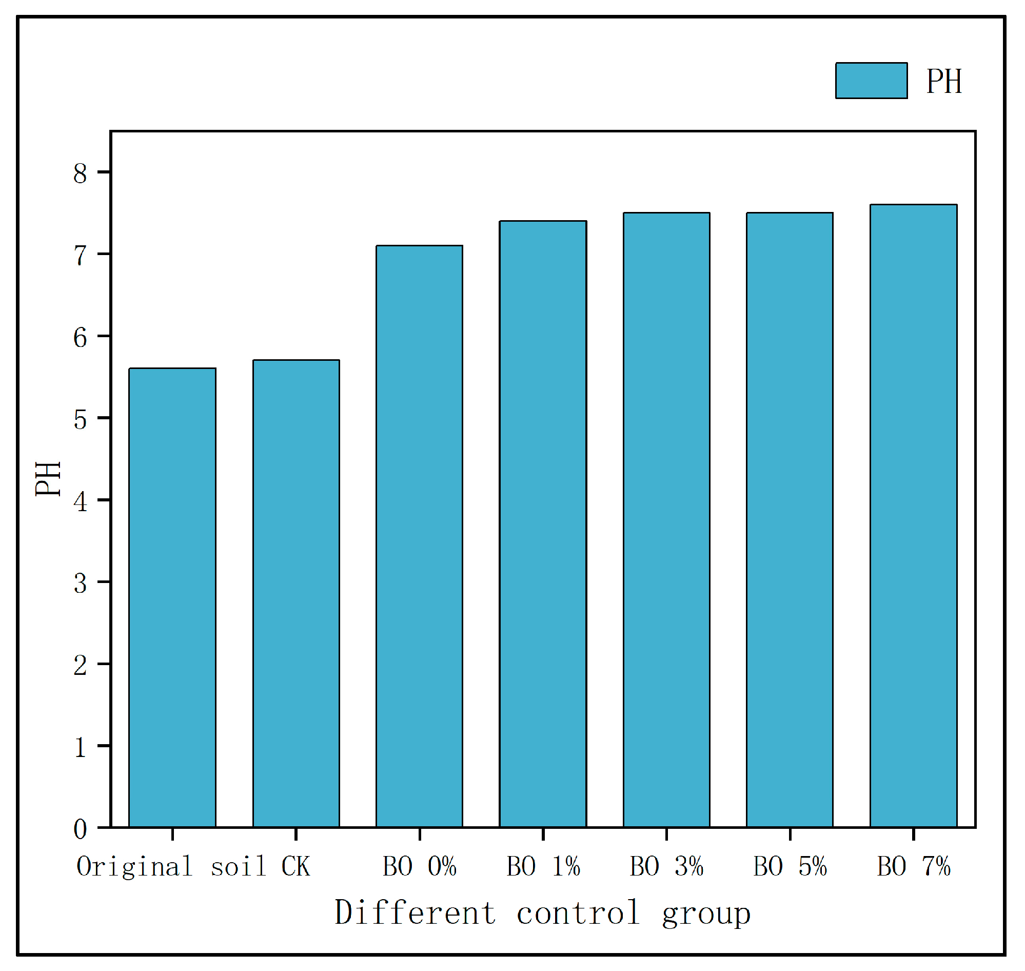 - Plant height: The plant height of Chinese cabbage in the BO 0% group (only microbial organic fertilizer) was 4 cm, while the heights in the biochar-amended groups (BO 1%, BO 3%, BO 5%, and BO 7%) were 9 cm, 12 cm, 7 cm, and 6 cm, respectively. The significant increase in plant height with biochar addition can be attributed to the combined effects of improved soil structure, enhanced nutrient availability, and reduced heavy metal toxicity. Biochar’s porous structure increases soil aeration and water retention, while its alkaline nature helps elevate soil pH, thereby decreasing the bioavailability of heavy metals such as Cd and Cu. Additionally, biochar facilitates the immobilization of heavy metals through adsorption and complexation, reducing their uptake by plants. The optimal plant growth observed in the BO 3% group suggests that this biochar concentration provides the most favorable conditions for root development and nutrient absorption, whereas higher biochar levels (e.g., BO 5% and BO 7%) may lead to nutrient imbalance or limited root space, thus inhibiting growth.