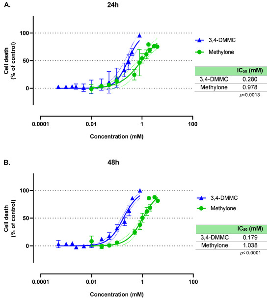 Nonlinear regression models for the cell death induced by methylone (green line) and 3,4-DMMC (blue line) in H9c2 cells, as evaluated by the MTT assay after (A) 24 h and (B) 48 h of exposure. The mean effects were fitted using a variable-slope nonlinear regression model (log[inhibitor] vs. normalized response). Dotted lines represent the 95% confidence band of each fit. Results were obtained from three independent experiments, performed in duplicate. Embedded tables display the estimated IC50 values for each compound at the respective exposure time, as well as p value for group comparison (methylone vs. 3,4-DMMC) of global fits.