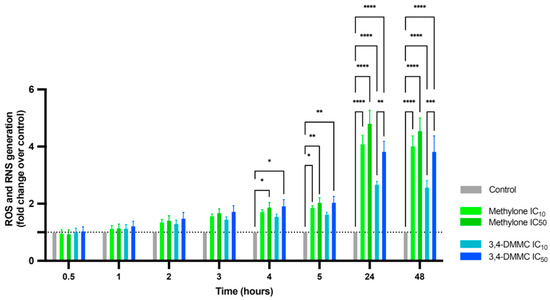 Intracellular ROS and RNS production in H9c2 cells after 30 min, 1 h, 2 h, 3 h, 4 h, 5 h, 24 h and 48 h of exposure to IC10 and IC50 3,4-DMMC (blue bars) or methylone (green bars). Data are presented as fold-increase over control (dotted line = 1). Results were obtained from three independent experiments, performed in duplicate. * p < 0.05, ** p < 0.01, *** p < 0.001, and **** p < 0.0001.
