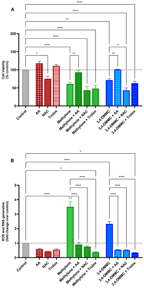 To gain further insight into the redox-related mechanisms underlying these observations, ROS/RNS production was evaluated under the same experimental conditions. As shown in Figure 3B, AA, NAC, and Trolox all exhibited robust ROS-scavenging activity, significantly preventing the methylone- and 3,4-DMMC-induced increase in ROS/RNS levels (p < 0.0001) and maintaining them below control values.