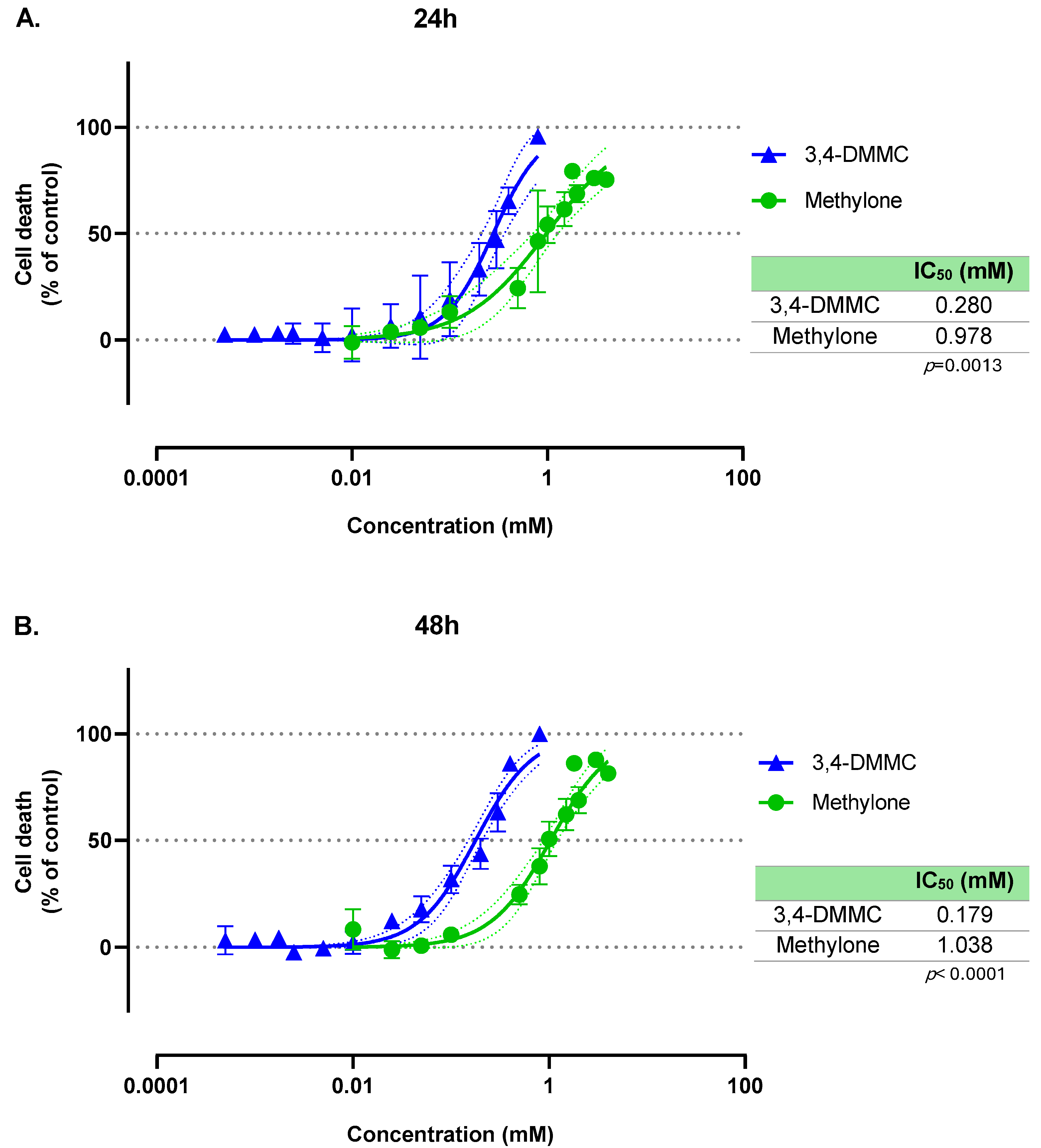 3.1. Methylone and 3,4-DMMC Induce Concentration-Dependent, but Time-Independent, Death of H9c2 Cardiac Cells