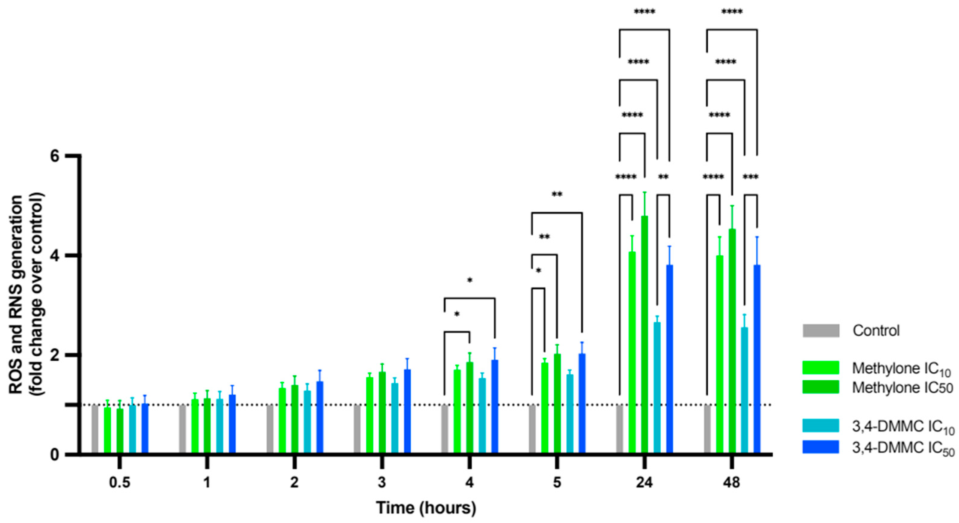 3.2. Methylone and 3,4-DMMC Promote ROS and RNS Generation in H9c2 Cardiac Cells