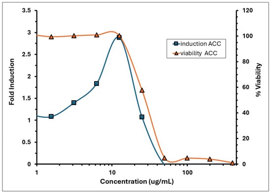 To further assess the skin sensitisation potential of A. calamus rhizome oil, the KeratinoSens™ assay was conducted. This assay evaluates keratinocyte activation, the second key event in the AOP for skin sensitisation, by measuring the Keap1-Nrf2-ARE-mediated activation of antioxidant response element (ARE)-dependent genes. The assay utilises the stably transfected HaCaT cell line, KeratinoSensTM (acCELLerate GmbH, Osterfeldstraße 12–14, 22529 Hamburg, Germany), and quantifies luciferase activity as an indicator of Nrf2 pathway activation. A significant increase in luciferase activity, exceeding predefined thresholds and occurring at non-cytotoxic concentrations, was considered indicative of a positive sensitisation response.
