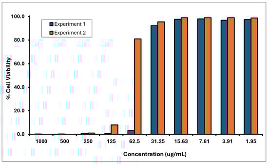In the DRF experiments, the cells were exposed to ten (1.75–1000 µg/mL), 2-fold serial dilutions of A. calamus rhizome oil in DMSO across two independent experiments. The CV75 value (the concentration resulting in 75% cell viability) was determined using propidium iodide staining and flow cytometry. Working solutions of the test items and controls were prepared in a 1:1 (v/v) ratio with cell suspensions in 96-well flat-bottom plates.