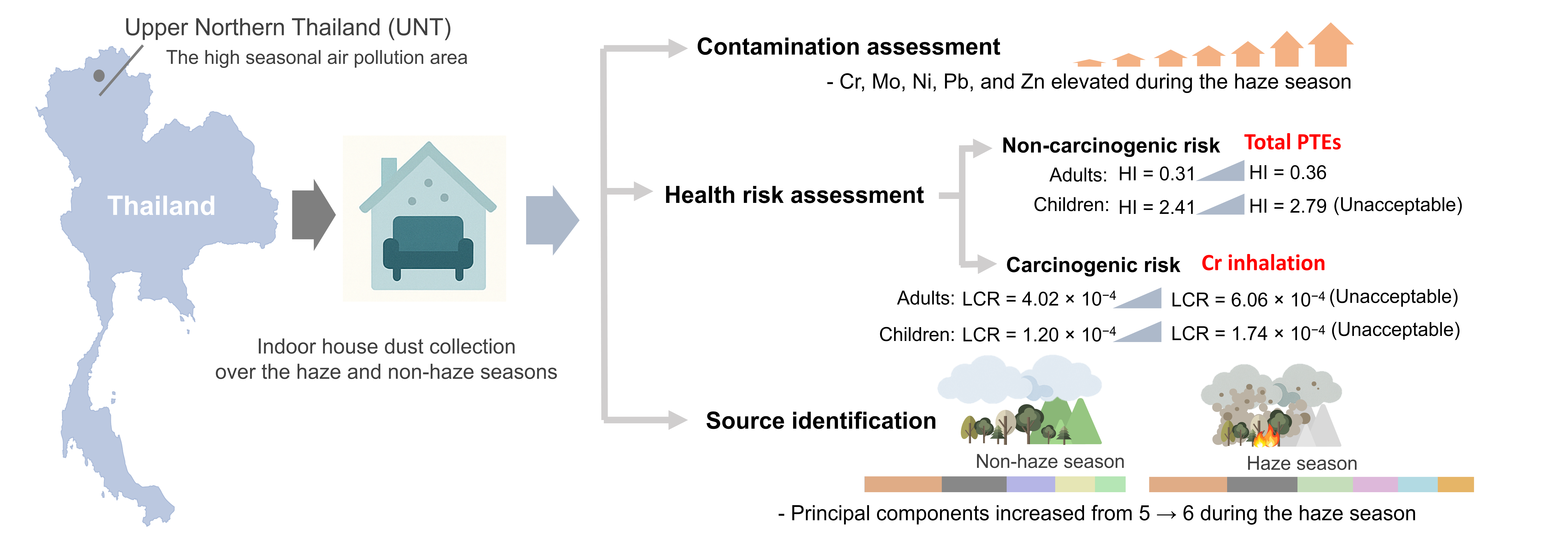 - Children faced unacceptable non-carcinogenic risks (HI = 2.51, increasing to 2.79 during the haze season, a 16% increase), primarily through ingestion.