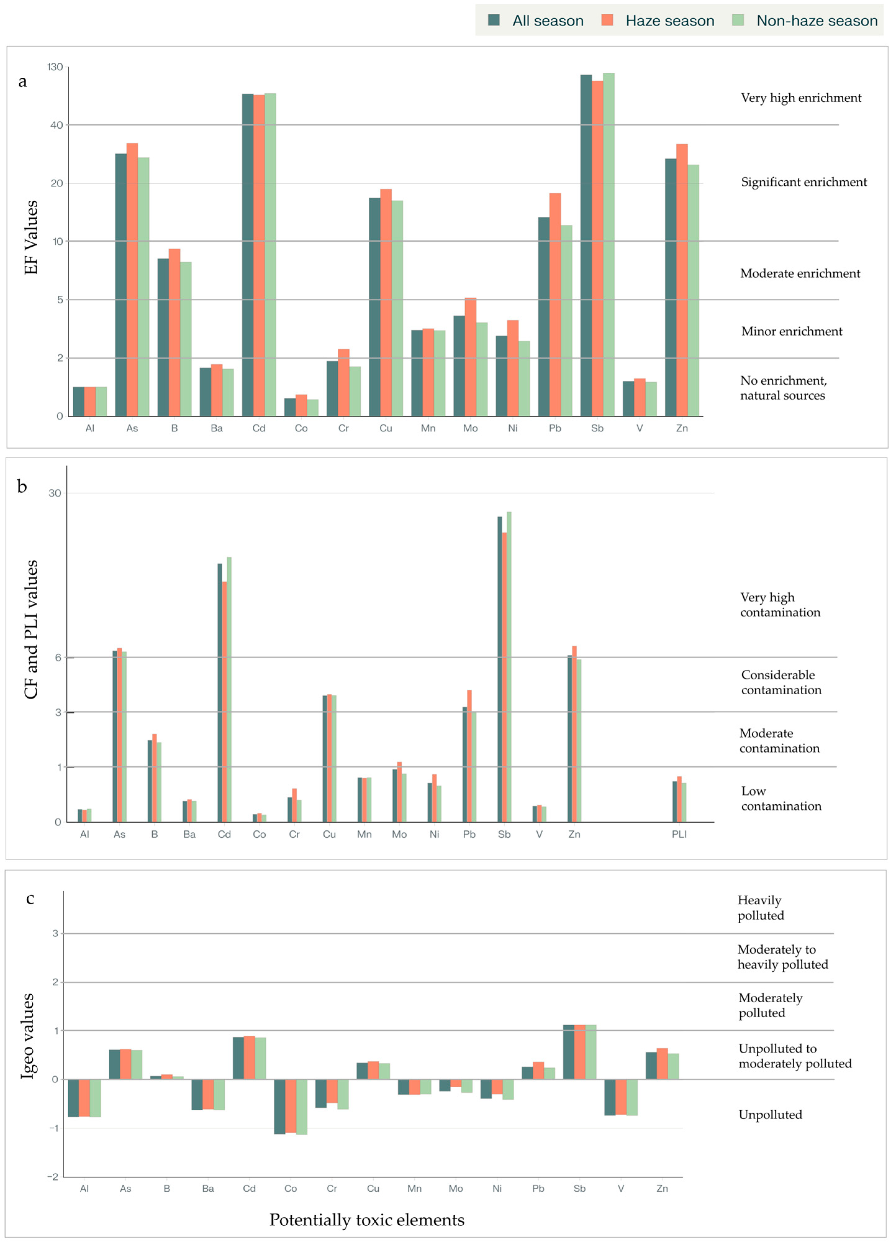 - Five PTEs (Cr, Mo, Ni, Pb, Zn) were significantly elevated during the haze season with corresponding increases in contamination indices.
