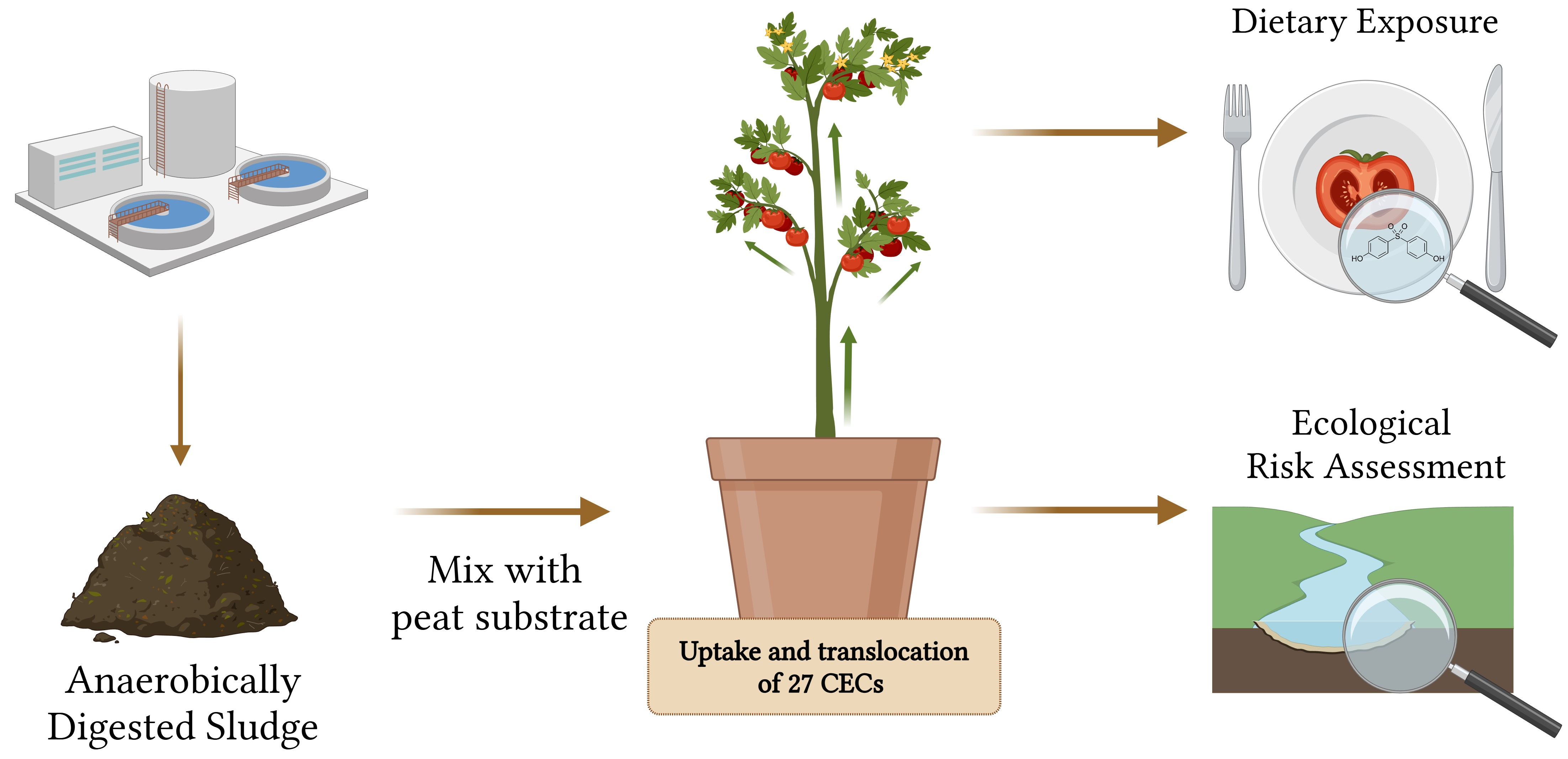 - Sewage sludge application in agriculture can introduce CECs into crops and growth media.