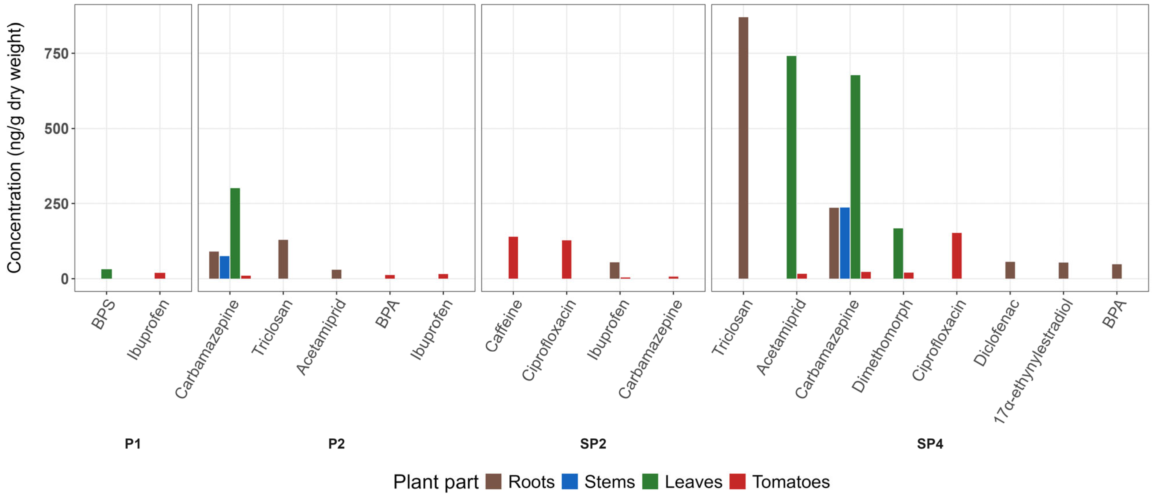 3.3. Bioaccumulation of CECs in Tomato Fruit